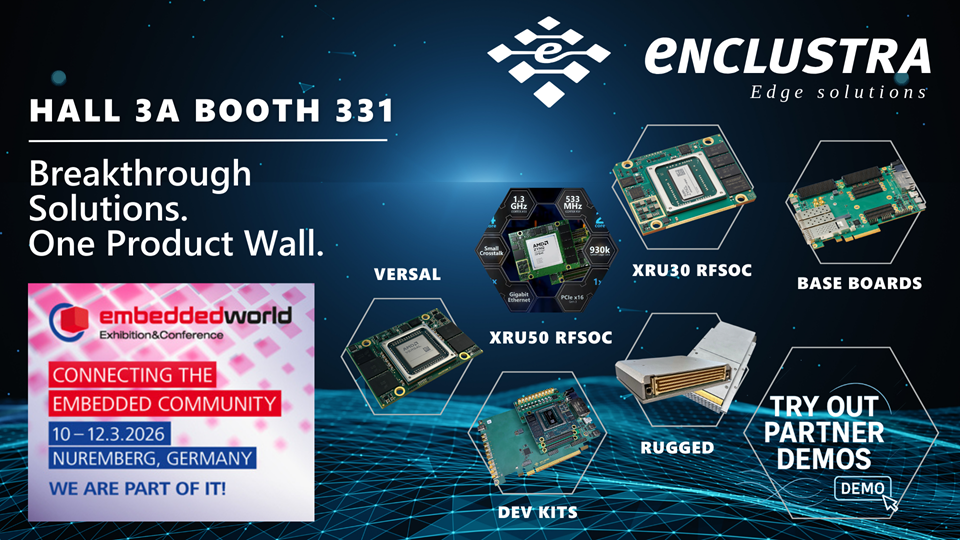 The excitement is building as we gear up for Embedded World 2026, the industry’s leading event for embedded systems. Get ready for the Enclustra immersive experience packed with breakthrough technologies, live partner demos, and hands-on innovation. Mark your calendars and visit us!