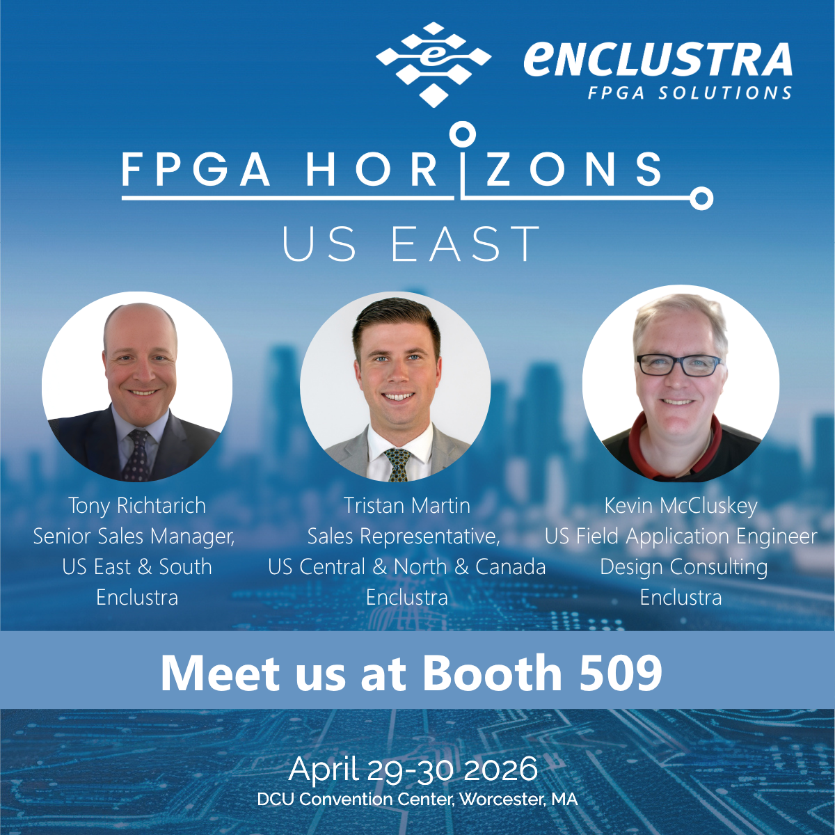 You can also meet Tony Richtarich, Tristan Martin, Sales Rep US & Canada, and Kevin McCluskey, US Field Application Engineer, at Booth 509 to discuss your next FPGA/SoC project and explore the right solution for your design.